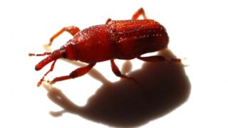 キャンプ場に鹿があらわれて草を食べています。